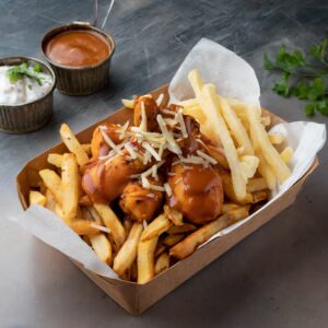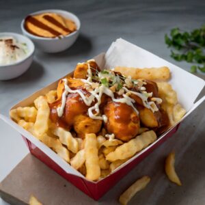 Homemade butter chicken (may contained nuts) juicy bite size piece, place on top of our crispy fries covered in cheese curds and hot delicious gravy or creamy mushroom gravy.
