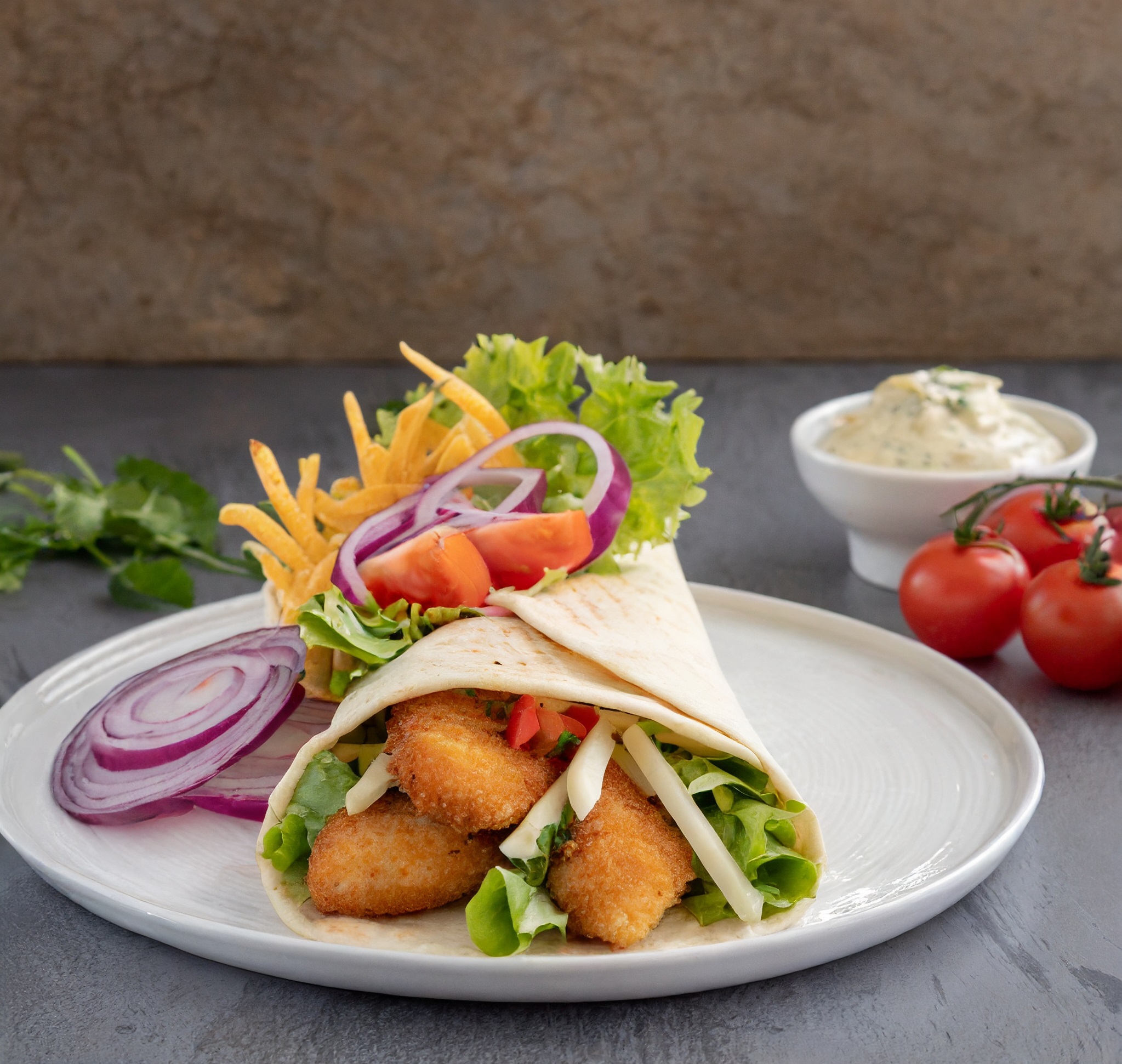 White tortilla, chicken schnitzel, mix salad, tomato, red onion, fire roasted pepper and dressing on your choice of dip ( Ketchup, mayo, mustard, peri -peri, ranch, or chipotle mayo )
