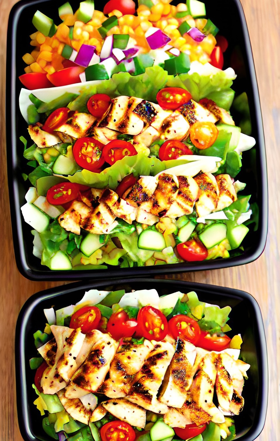 Fresh mix salad, Cherry tomato, Avocado, yellow shredded Cheddar cheese, mix beans, corn, and lemon garlic/ Lemon honey garlic/ maple garlic dressing.